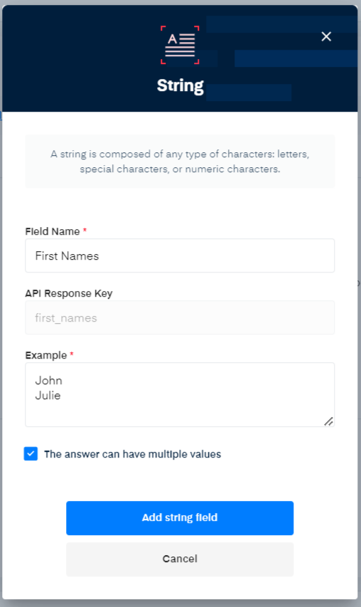 * **String**: This field is the most generic one. You can use it to extract a specific text from a document, i.e. a First Name from an Id card.