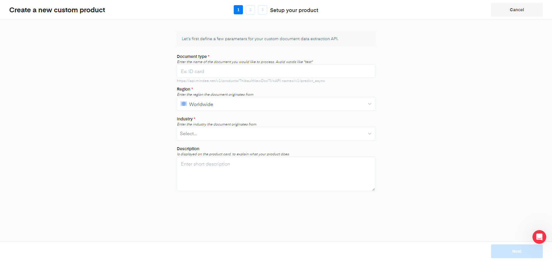 > 📘 The Document type, the Region and the Industry are used to pre generate a first data model to set you on the right path to a performant product.