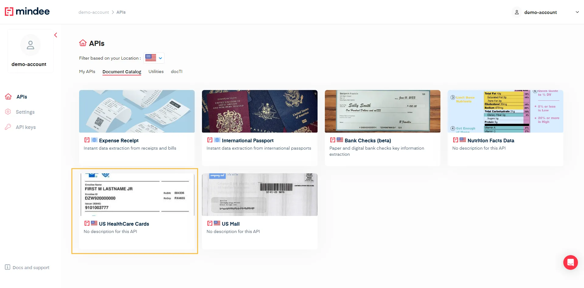 2. Access your US Healthcare Cards API by clicking on the corresponding product card in the **Document Catalog**