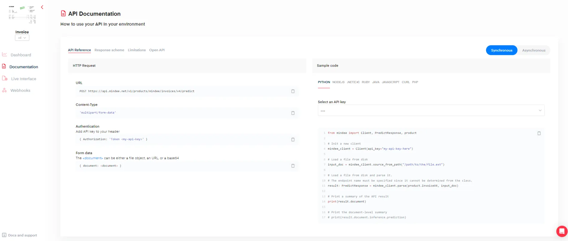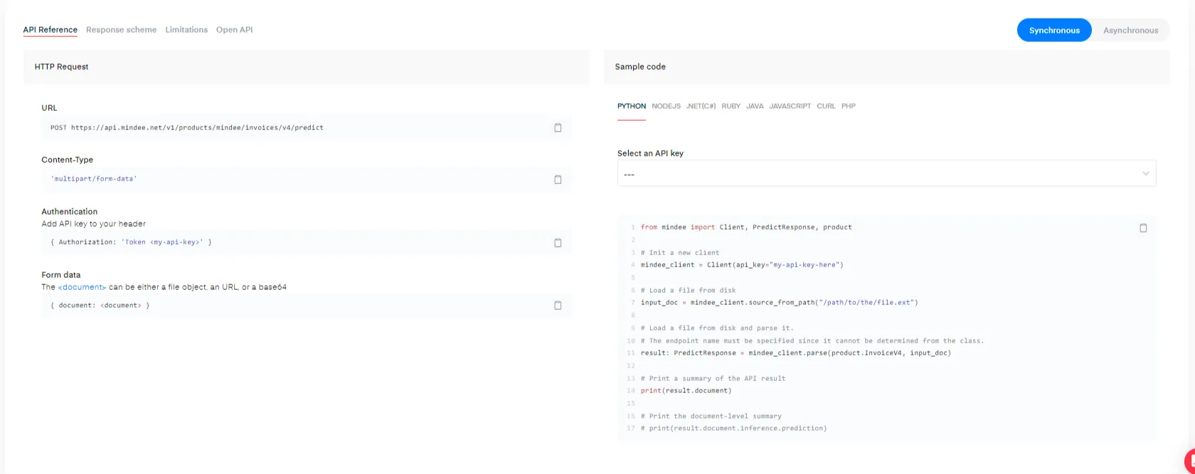 Some products like [Financial Documents](https://docs.mindee.com/v1/off-the-shelf-products/financial-documents-ocr) propose both a synchronous and an asynchronous endpoint. You can select the corresponding documentation by clicking on the toggle button on the top right hand corner.