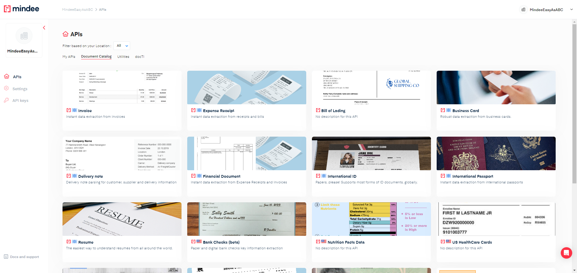 When you log into Mindee, you will land on the APIs page. This page is organized into four main sections: