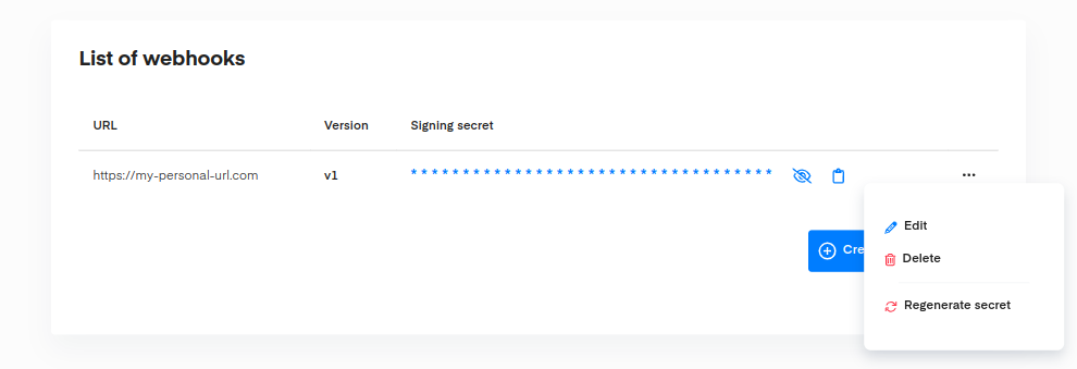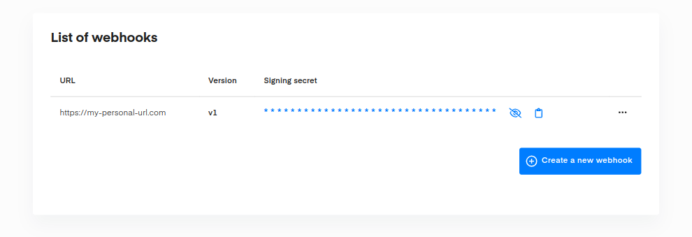 You can, at any point in time, visualize your signing secret by clicking on the crossed eye icon. You can also click the clipboard icon in order to copy the secret to add it to your code easily.