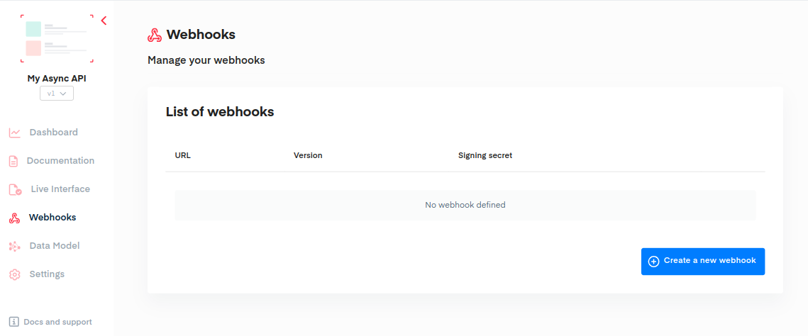 To do so, click on the **Webhooks** item from your API menu. On this interface you'll be able to create, edit or delete your webhooks configuration.