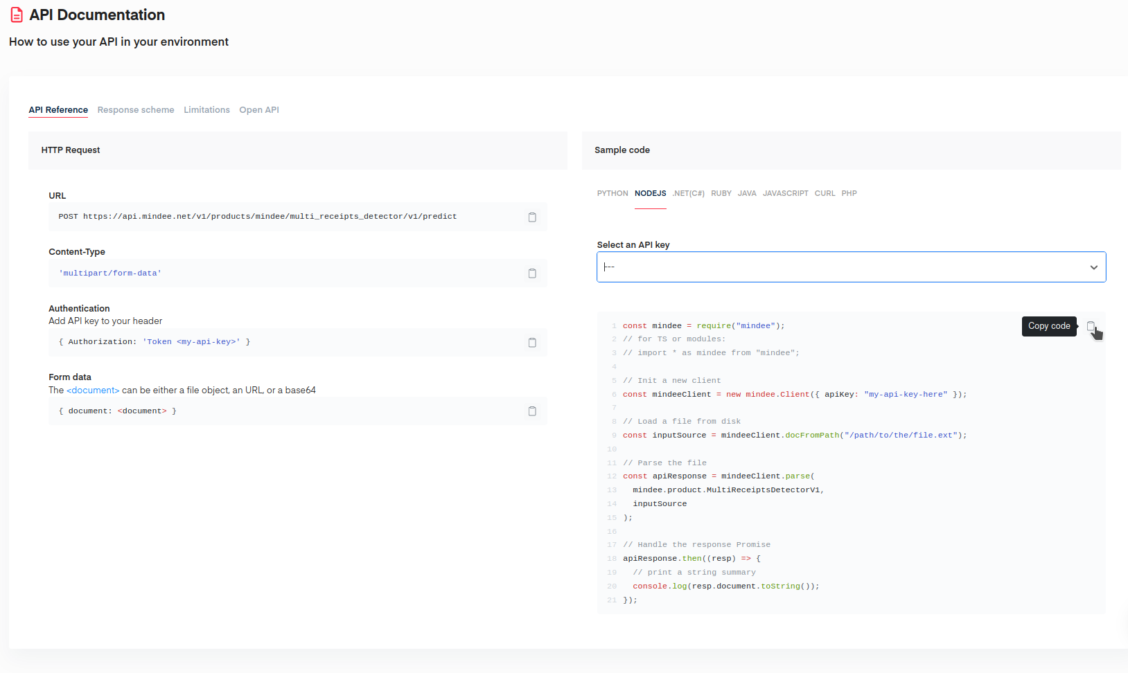 From there we'll click on your language (`NODEJS`), then `Select an API key`, and finally use the copy code button: